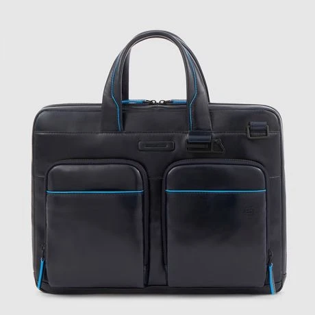 Luxe lederen laptoptas uit de nieuwe Blue Square Revamp serie van Piquadro. Met Blue Square Revamp zijn de beste modellen uit de Blue Square serie sportiever van uitstraling dankzij de minder felle blauwe randen en is alle hardware, waaronder de rits en de ritspullers in prachtig mat zwart. Deze slanke laptoptas bevat een ruim hoofdcompartiment met ruimte voor een 14″ laptop en een 12.9″ iPad/Tablet. Verder bevat de tas een groot voorvak, twee kleine georganiseerde voorvakjes en achterop een ritsvak.