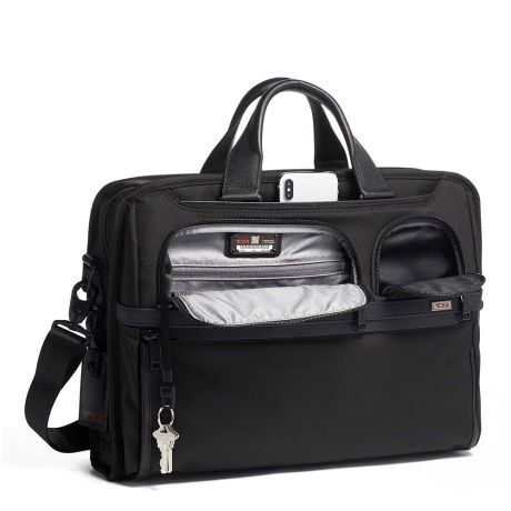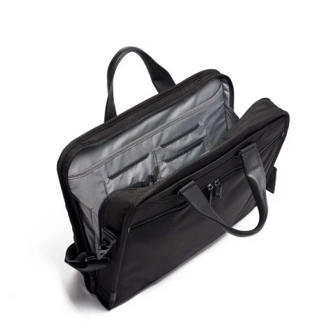 Ruime laptoptas uit de Alpha 3 serie van Tumi. De Alpha 3 serie is gemaakt van het ultraduurzame, signature FXT® ballistic nylon. Deze iconische business- en reisproducten brengen innovatief design, superieure prestaties en de beste functionaliteit samen. Ruim ingedeelde laptoptas met gewatteerd laptop vak geschikt voor laptops tot 17″, gevoerd tablet vak en georganiseerde indeling geschikt voor al je zakelijk materialen (A4). Voorop zitten 2 extra ritsvakken waarvan een met waterbestendige binnenvoering. Ritsvak achterop die tevens voldoet als smart-sleeve om de tas aan een trolley te bevestigen. Met twee handgrepen en afneembare schouderriem gemakkelijk mee te nemen.