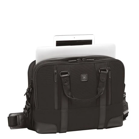 Laptoptas uit de Lexicon Professional serie van Victorinox. De laptoptas is voorzien van twee compartimenten met handige organisatorische oplossingen voor je dagelijkse activiteiten, dit helpt je vlot te verplaatsen van de ene vergadering naar de andere, waar ook ter wereld. Dankzij de waterdichte ritsen en het Swiss-engineered beschermingssysteem, samengesteld uit Lanidur – een ultra-sterke stof – blijft je 13″ laptop te allen tijde beschermd. Met smart sleeve om de tas een trolley te kunnen bevestigen.